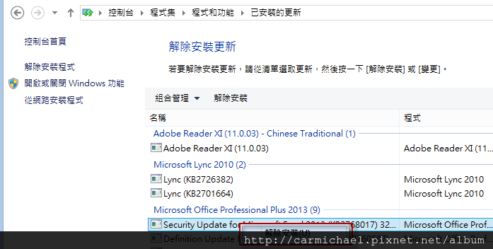 若你使用的是透過Windows Update自動安裝更新的方式安裝的,直接下載刪除程式功能的後續更新並移除KB2817630,關閉Outlook再重新啟動電腦即可